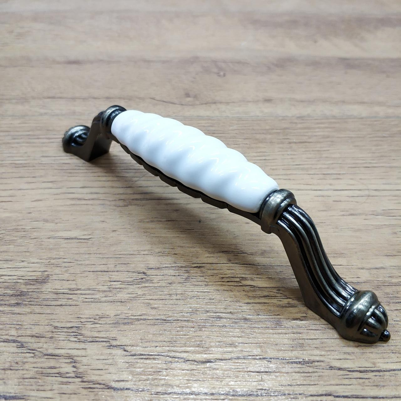 Ручка изготовлена из прочного металла, имеет декоративно-защитное покрытие в цвете чёрный античный никель.
