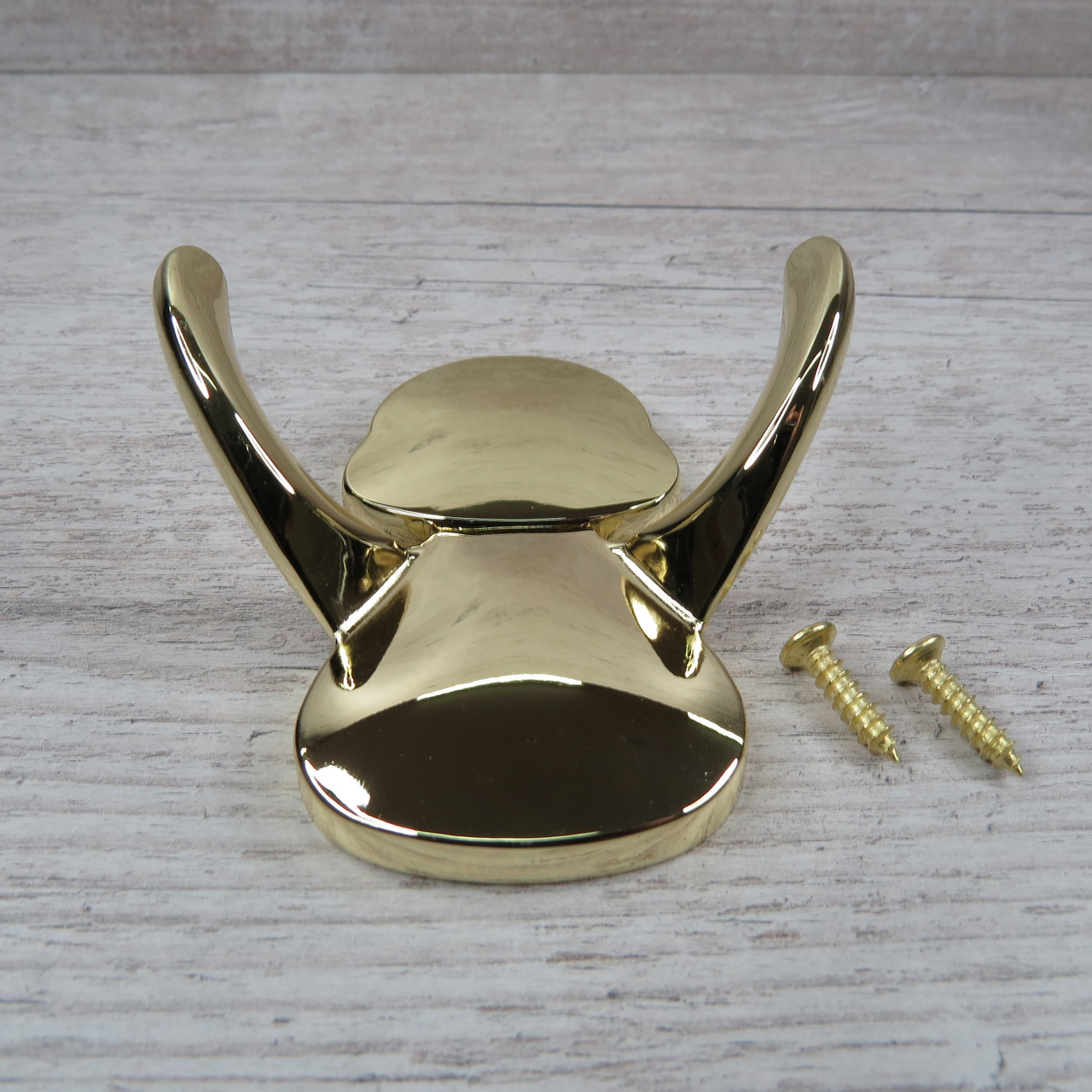 Стильный двухрожковый мебельный крючок, изготовлен из прочного цинкового сплава, имеет декоративно-защитное покрытие в золотом цвете.